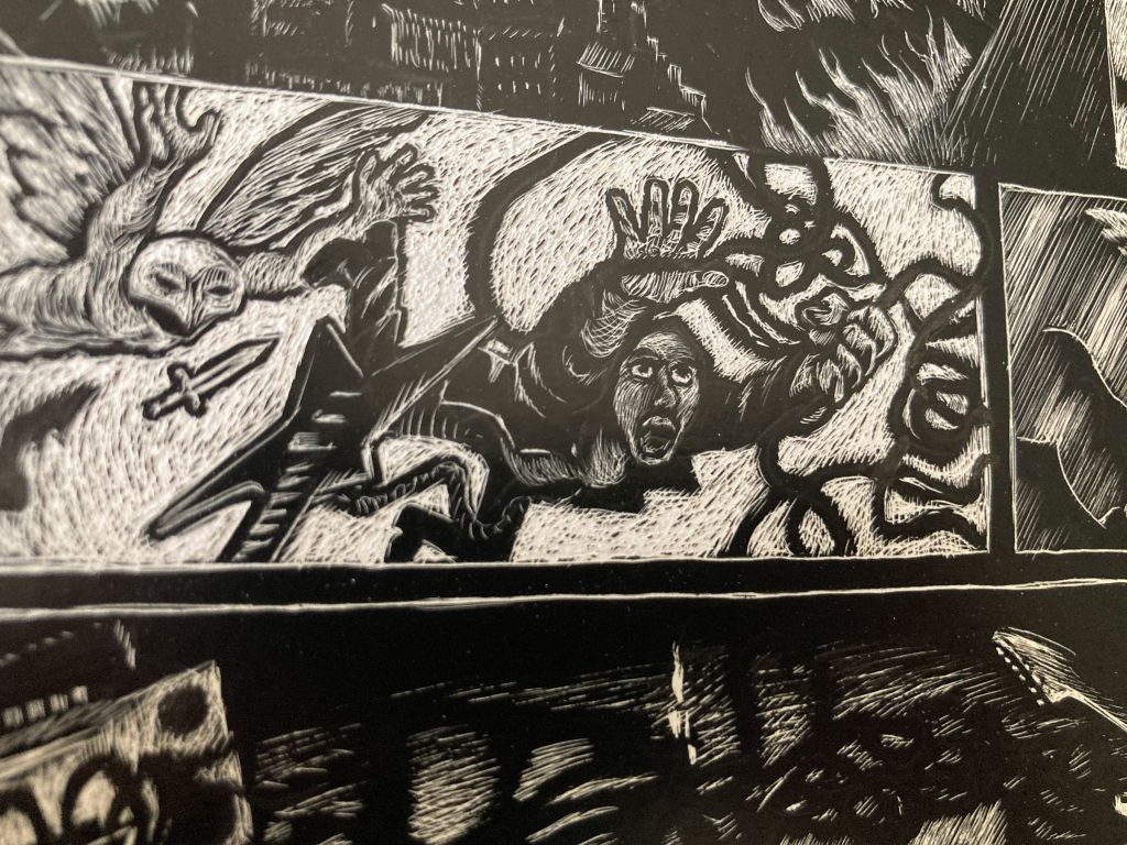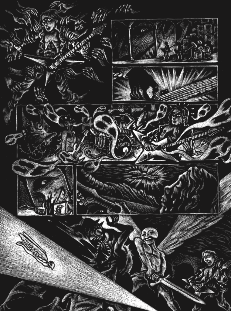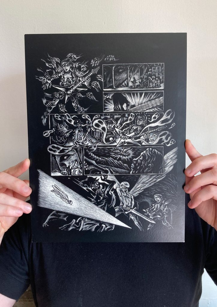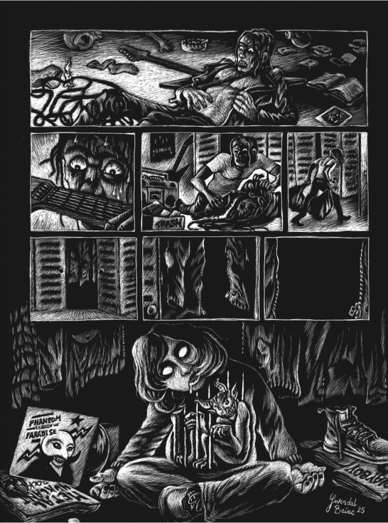 Holy Metal Guts est une histoire réalisée en carte à gratter : Tommy est un ado des années 90 fan de métal et d’occultisme, lors d’un rituel il va déchirer la réalité. 9 pages, juin 2025.